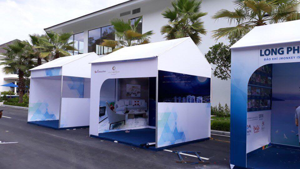 Gian hàng triển lãm tiêu chuẩn vách cứng, ngoài trời: khung nhôm, vách ván MDF sơn trắng. Mái bạt sắt phi tròn hoặc khung rạp nhà lều metro 3D